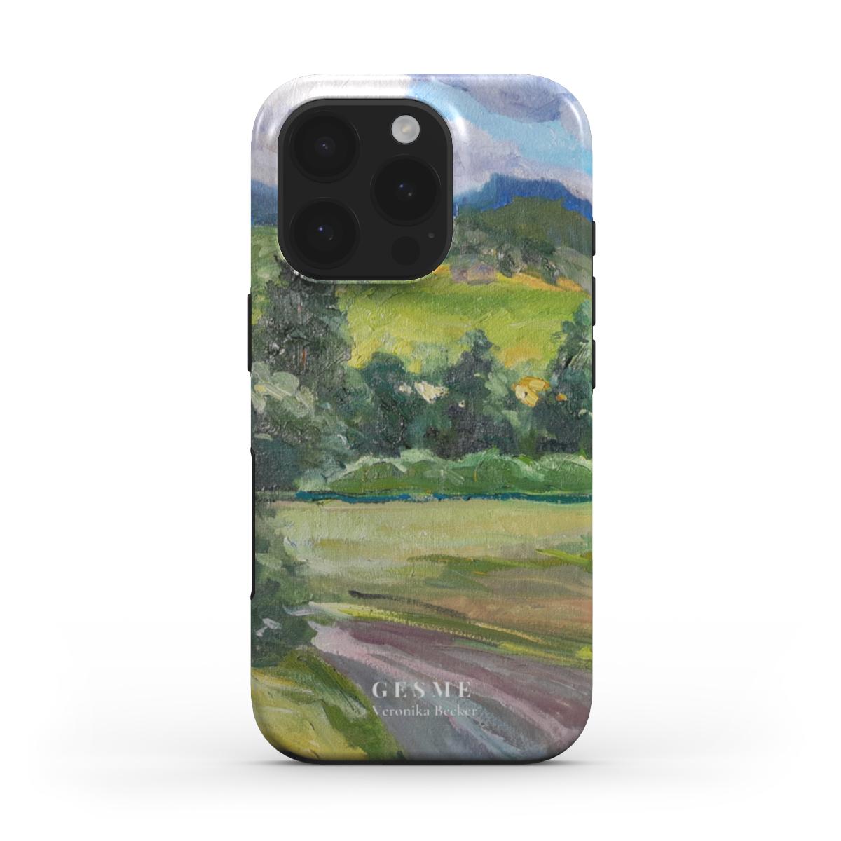 Žvilgsnis į šį Veronikos Becker paveikslą tarsi atveria tylų, kvėpuojantį kraštovaizdį, kuriame gamta gyvena be skubos ir be žmogaus triukšmo. Švelnūs kalvų kontūrai, persiliejantys žali ir melsvi tonai kuria ramybės pojūtį, o debesuotas dangus suteikia erdvei gylio ir lengvo melancholiško susimąstymo. Medžiai čia ne detalės, o gyvos masės – jos pulsuoja, juda, lyg būtų pagautos trumpame vasaros akimirksnyje prieš lietų ar po jo.
