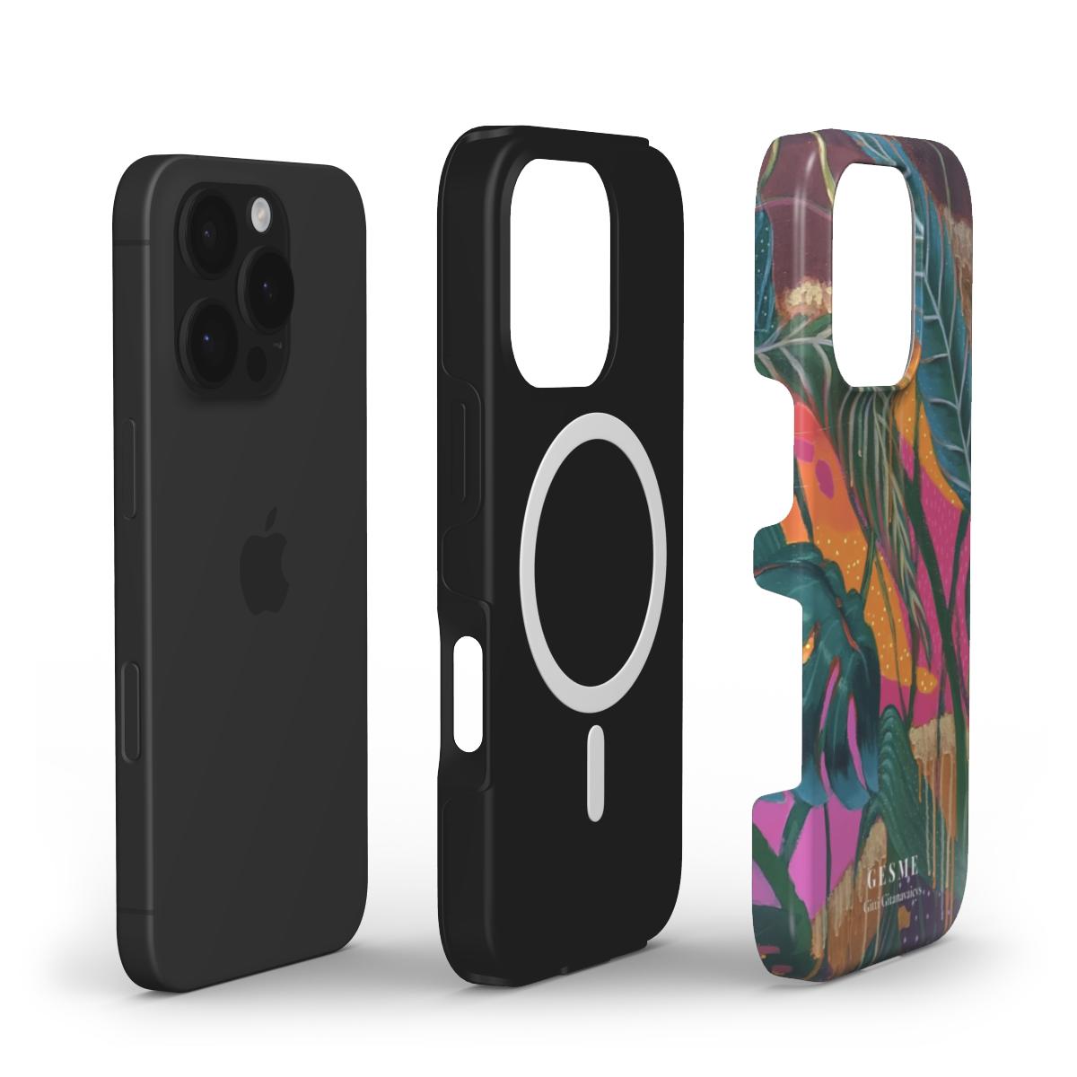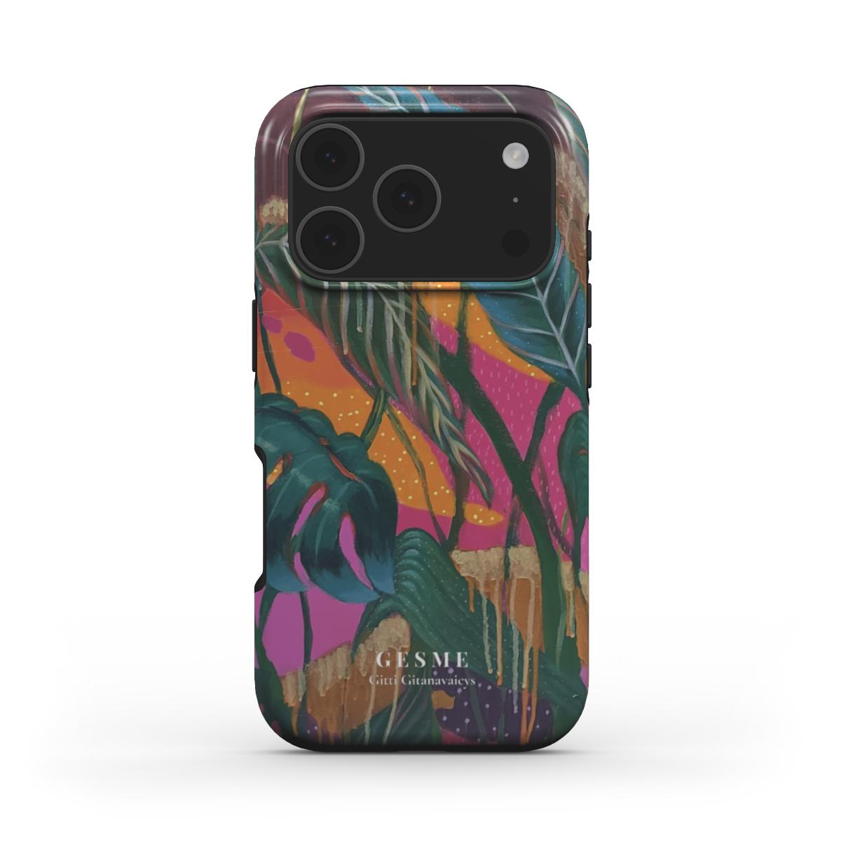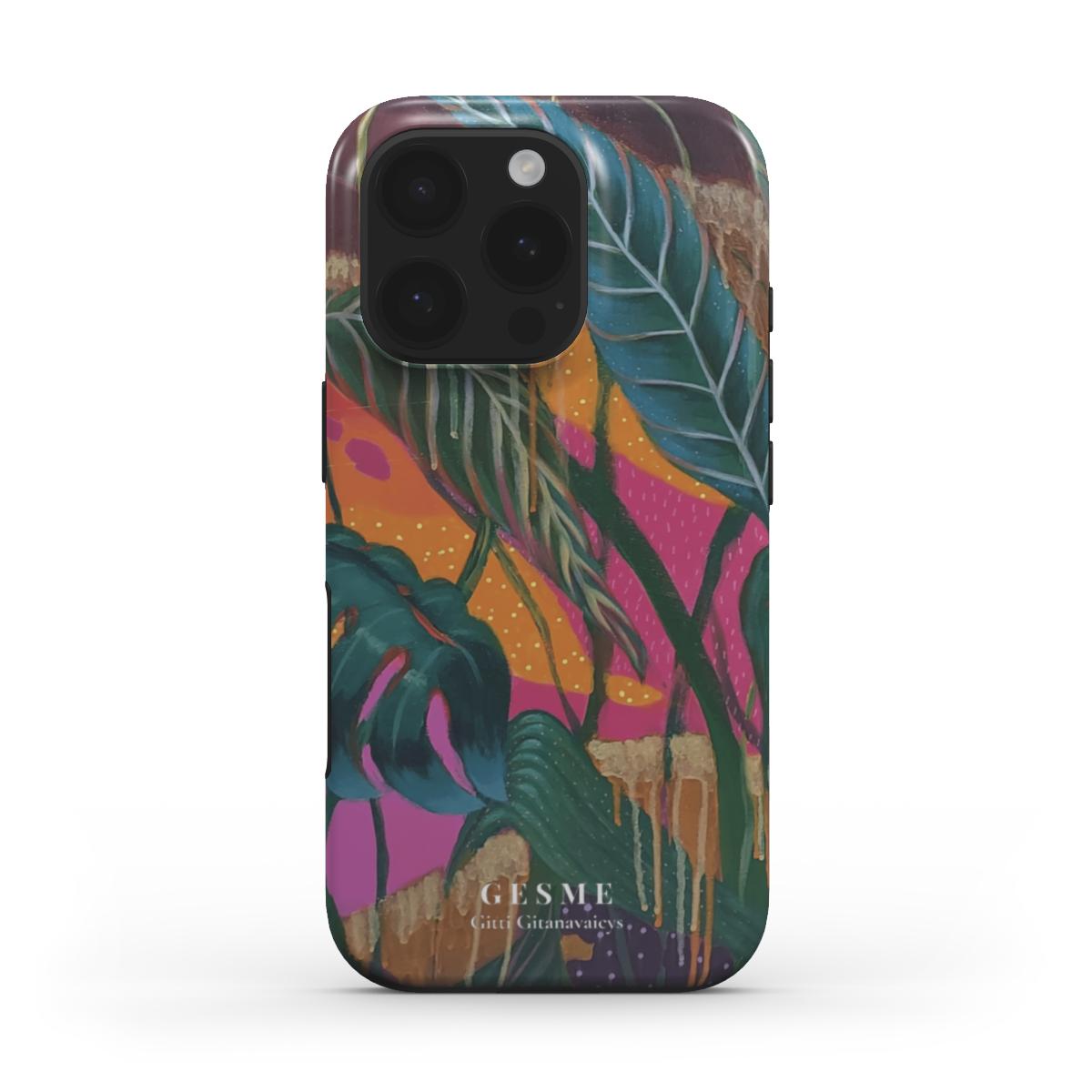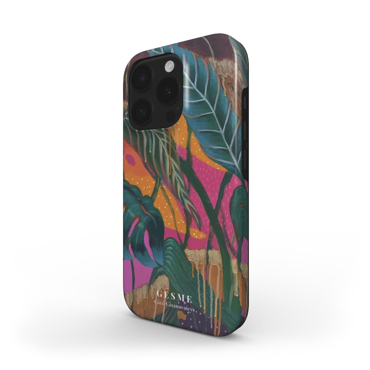 „Tikrasis Ryšys“ pulsuoja ryškiomis spalvomis ir vešliais botaniniais motyvais, simbolizuodamas harmoniją tarp žmogaus ir gamtos. Žalių, oranžinių ir magentos tonų potėpiai kuria gyvybingą kompoziciją, kviečiančią vėl pajusti ryšį su pasauliu aplink mus. Šis telefono dėklas skirtas tiems, kurie vertina grožį, energiją ir prasmingų akimirkų įkvėpimą.